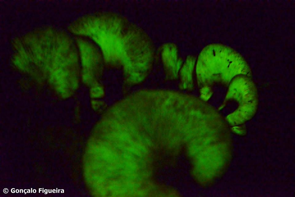 Encontrei estes cogumelos bioluminescentes no parque florestal de Monsanto a 4 de Novembro deste ano. São presumivelmente da espécie Omphalotus olearius. Desde quando encontrei esta colónia (2010)todos os anos, costumo de a visitar. Tem sido interessante verificar a retracção e a expansão deste núcleo populacional conforme as condições meteorológicas e as alterações no habitat. Em certos anos surgem até exemplares de grandes proporções.