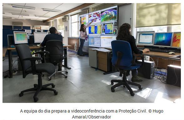 A partir das 8h, quando entra o turno do dia, a principal prioridade é preparar a videoconferência com a Protecção Civil, que ocorre todos os dias às 10h40. Depois de o sossego da madrugada ser perturbado momentaneamente enquanto as equipas que saem e entram falam entre si, o silêncio regressa à sala e Sandra Correia lança-se à criação de uma apresentação de PowerPoint. Tem mais ou menos duas horas e meia para preparar um conjunto de cinco ou seis diapositivos. Parece fácil, mas envolve ler e reler mapas, ler e reler observações, ler e reler gráficos. E, por vezes, atender telefones.