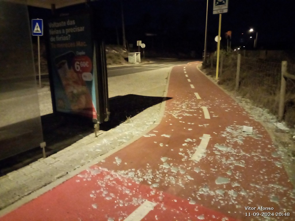 não creio em absoluto que tenha sido um acto de vandalismo, mas sim a fúria do vento que deve ter literalmente arrancado o vidro dos suportes, alias um outro já estava parte fora de um dos suportes, possivelmente poderá ter tido o mesmo destino
